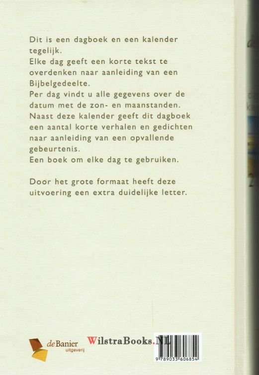 | Bijzonderheden: | Dagboek in heel duidelijke grote letter. Speciaal voor ouderen en slechtzienden. Dit dagboek is nieuw. De 'Banier Dagboekkalender 2010' is een dagboek bij de Statenvertaling. Voor elke dag is er een meditatie naar aanleiding van een Bijbelgedeelt... |