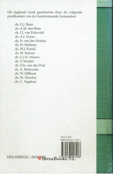 | Bijzonderheden: | Gebruikt Bijbels dagboek. Dit dagboek werd geschreven door de volgende predikanten van de Gereformeerde Gemeenten: ds. G.J. Baan, ds. A.M. den Boer, ds. J.J. van Eckeveld, ds. A.J. Gunst, ds. B. van der Heiden, ds. H. Hofman, ds. W.J. Karels, ... |