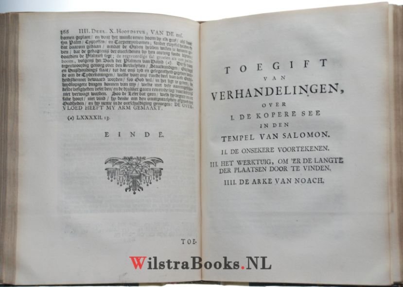 | Bijzonderheden: | 1742, [34], 544, [68] pag., opn.geb. In oud half perkament, met fraaie titelprent en alle 7 (uitvouwbare) gravures/kaarten. Heldere pagina's en kwalitatief hoogwaardige prenten. In goede antiquarische staat. |