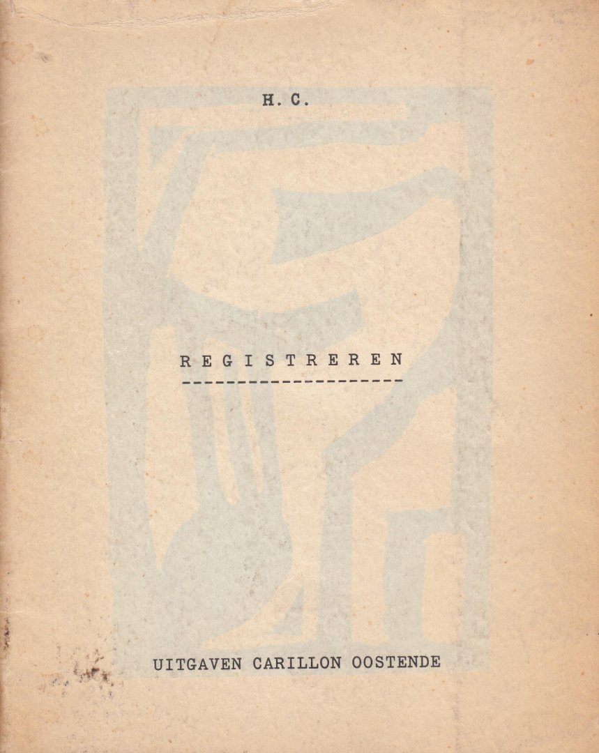Niettegenstaande de niet echt kleine oplage één van de meest schaarse Claus-edities. \nMet 'Een bandontwerp' van St Martens-Leerne [=Hugo Claus]. \nColofon: ”Van de plaquette “REGISTREREN” van HUGO CLAUS, werden 150 exemplaren gedrukt op Metropole papier en genummerd van 1 tot 150.\"\nIn tegenstelling tot wat het colofon beweert, bleven de exemplaren ongenummerd. \nBibliografie Hugo Claus voor twaalf... nr 2.