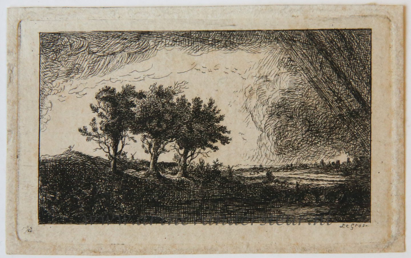 | Bijzonderheden: | Small scale copy after Rembrandt's three trees. Signed on the bottom right: 'Le Gros.' On verso collector's mark of the Albertina [L.5f] and pencil annotations in German. |