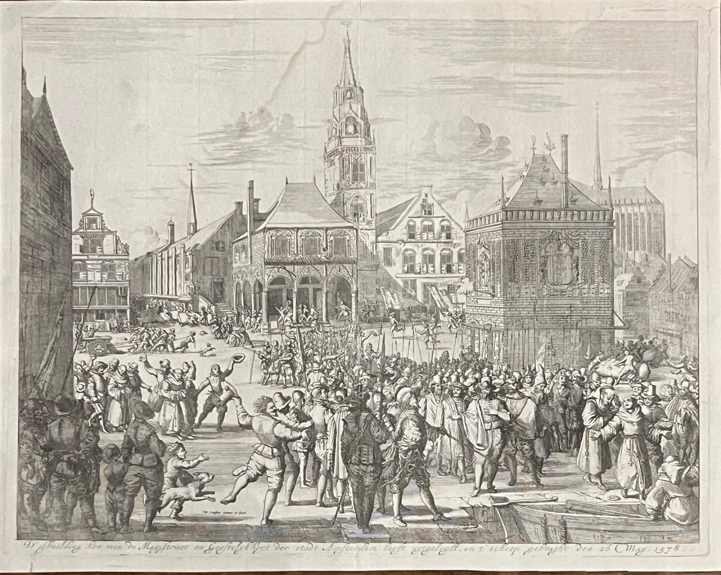 | Titel: | [Antique print, etching] 'D' afbeelding hoe men de Magistraet en Geestelykheyt der stadt Amsterdam heeft uytgeleydt, en t' scheep gebraght den 26 May 1578'; 'Alteratie' of Amsterdam, 1578, published 1703. |
