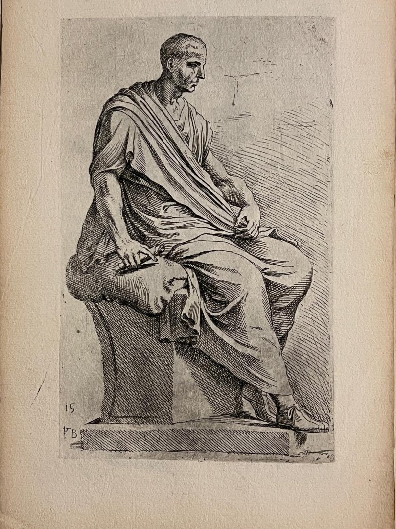 | Bijzonderheden: | The statue of a seated Roman consul seen from the side. Signed and numbered on the bottom left corner: "FP B / 15", FP monogrammed. B stands for "Bergognone", as he was also known in Italy.From 'Segmenta Nobiliarum Signorum et Statuarum', a series... |