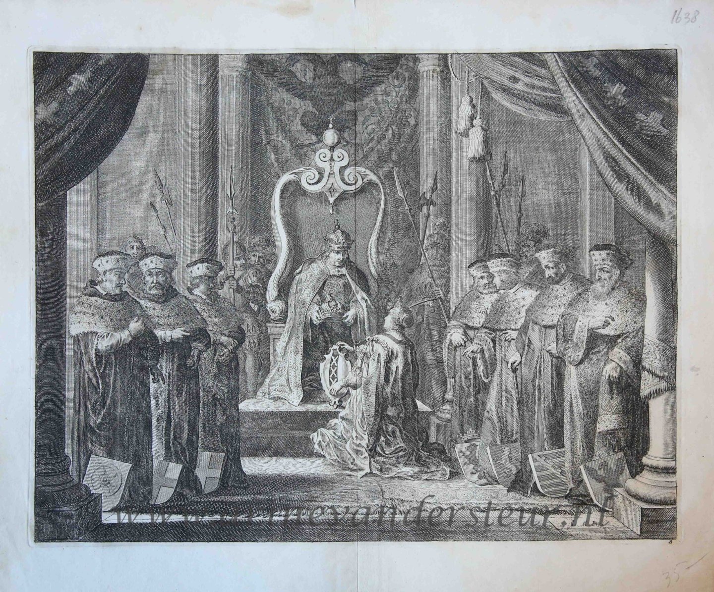 | Titel: | [Antique history print, etching] Amsterdam receives the imperial crown from Emperor Maximilian, published 1639. |