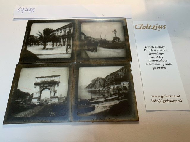 Collection of 19th century glass lantern slides: Serie IX, nrs. 7, 16, 18, 19: Rome: Arch of Titus (Forum Romanum), Isle of Capri Grande Marina, Messina: Victor Emanuel Sreet, Messina: Town Hall Place. 4: 19th century, 8x8cm, glass lantern slides, very attractive photographic reproductions produced for presentation purposes and as souvenirs.