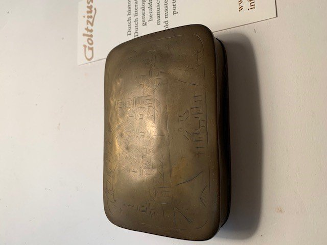| Meer info: | Tabaksdoos, tobaccobox late 18/early 19th century, 12x7,5cm, copper tobacco box with a landscape of Utrecht on the lid and the coat of arms of Utrecht on the bottom, the landscape shows wear and tear as result of the use of the box. |