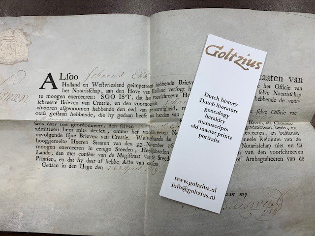 Vellum confirmation of 26 April 1759 signed by R. v. Bleiswijk that Johannes Ebbe was admitted as Notaris (civil notary) by de Staaten van Holland and Westvriesland and that the oath was taken in front of Pieter Meerman, member of the court. Vellum, 20,5x33,5cm, printed and handwritten document concerning the appointment of Johannes Ebbe as notaris (civil-notary) by de Staaten van Holland and Westvriesland. Johannes Ebbe was notaris in Den Haag. Blind stamp 8G in left corner. Document in very good state.