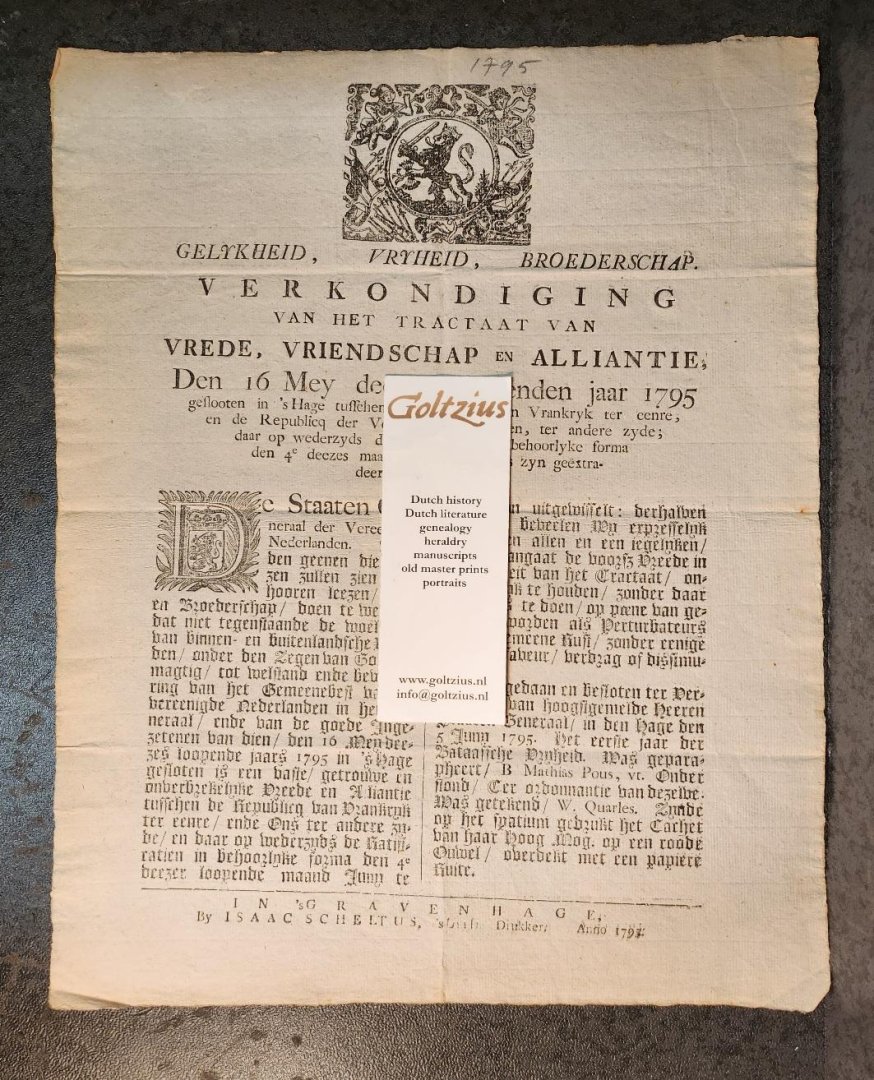 | Meer info: | Verkondiging van het tractaat van vrede, vriendschap en alliantie. Den 16 mey 1795 (...) geslooten tusschen de republicq van Vrankrijk en (...) der Ver. Provincien. Gravenhage 5-6-1795. Groot blad plano, gedrukt. M14499 |