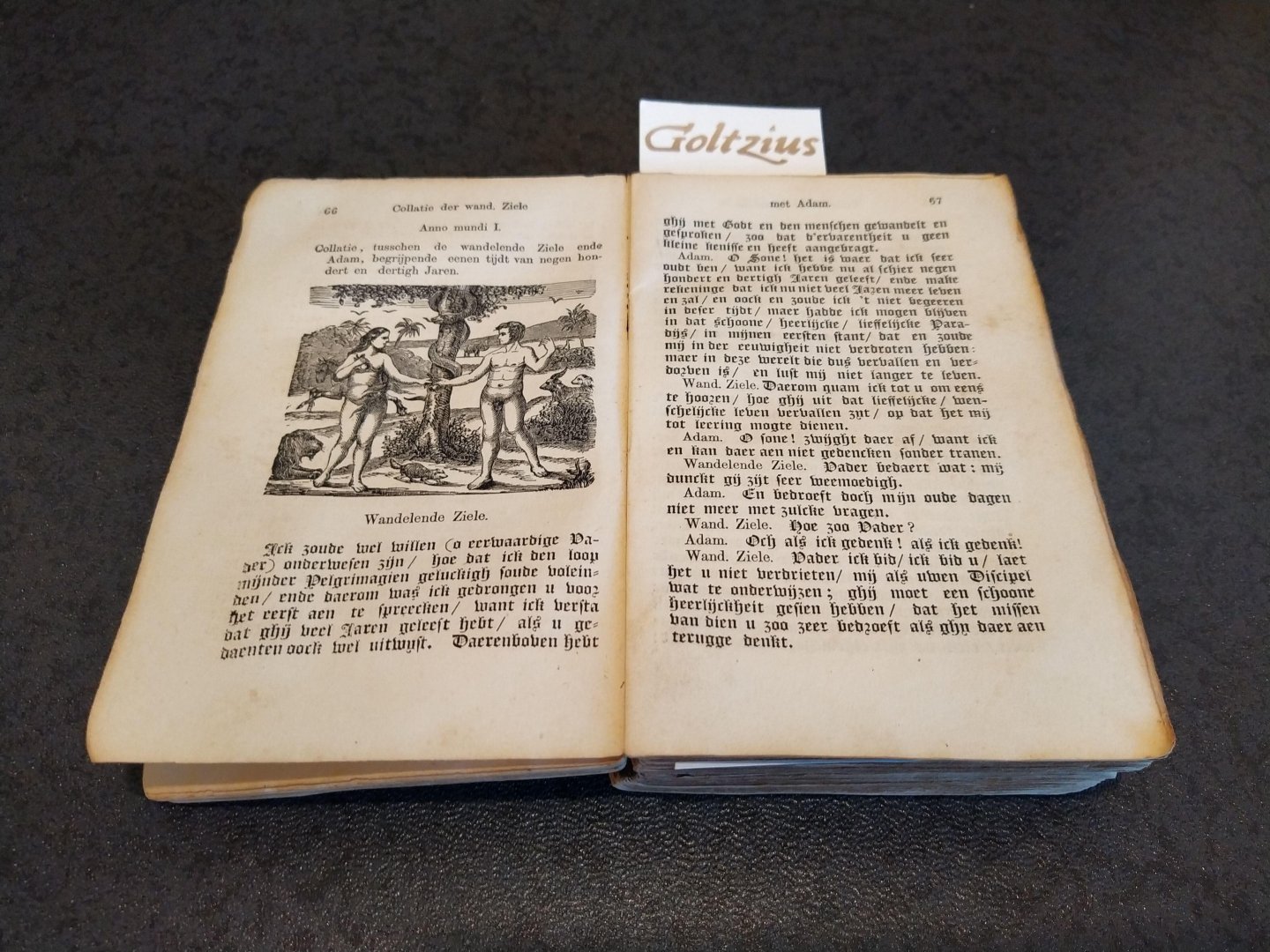 Lusthof des gemoedts. Inhoudende verscheiden geestelicke oeffeninge. Met noch drie collatien der wandelende ziele, Met Adam / Noah / en Simon Cleophas. Vervattende de geschiedenissen des eersten werelts, tot op den Patriarch Abraham toe. Sneek, J. Campen, [ca.1890], 8vo., paperbound, 557 pp., worn copy: paper cover is damaged exposing the loosely bound signatures, titelpage damaged in the bottom right corner, waterstains, some sections show foxing and browning, with woodcuts throughout the text. With a handwritten note on the inside of the front cover: "Voor Arno, uit grote erkentelijkheid om z'n vakmanschap (...) Amsterdam 09-08-'88 Riet Visser" and another handwritten note between the pages.