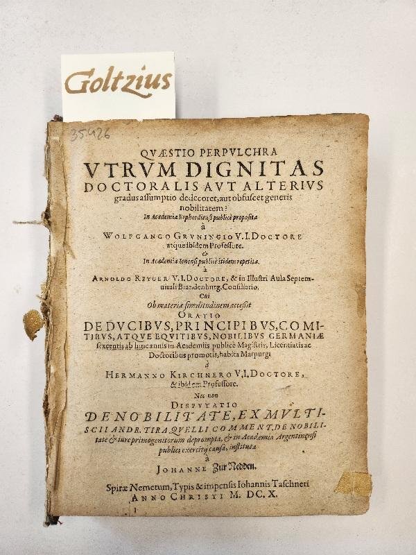 1. Quaestio perpulchra utrum dignitas doctoralis aut alterius gradus assumptio dedecoret, aut obfuscet generis nobilitatem? In Academia Erphordiensi publicè proposita à Wolfgango Gruningo V.I doctore atque ibidem professore & in Academia Ienensi publicè itidem repetita à Arnoldo Reyger V.I. doctore, & in illustri aula Septemuirali Brandenburg Consiliario cui ob materiae similitudinem accessit 2. Oratio de Ducibus, principibus, comitibus, atque Equitibus, nobilibus Germaniæ fexcentis ab hincannis in Acamemiis publicè Magistris, Licentiaris ac Doctoribus promotis, habita Marpurgi à Hermanno Kirchnero V.I. Doctore, & ibidem Professore. 3. Nec non Disputatio de nobilitate, ex multiscii Andr. Tiraquelli comment. De nobilitate & iure primo genitorum deprompta & in Academia Argentinensi publici exercitij causa, instituta à Johanne zur Nedden. Speyer, Johann Taschner, 1610, 4to., without binding, [100] pp., darkened edges, small parchment bookmark attached to the first titlepage, with some docorative elements. l Convolute of 2 orations and 1 dissertation with seperate titlepages but continuous signatures