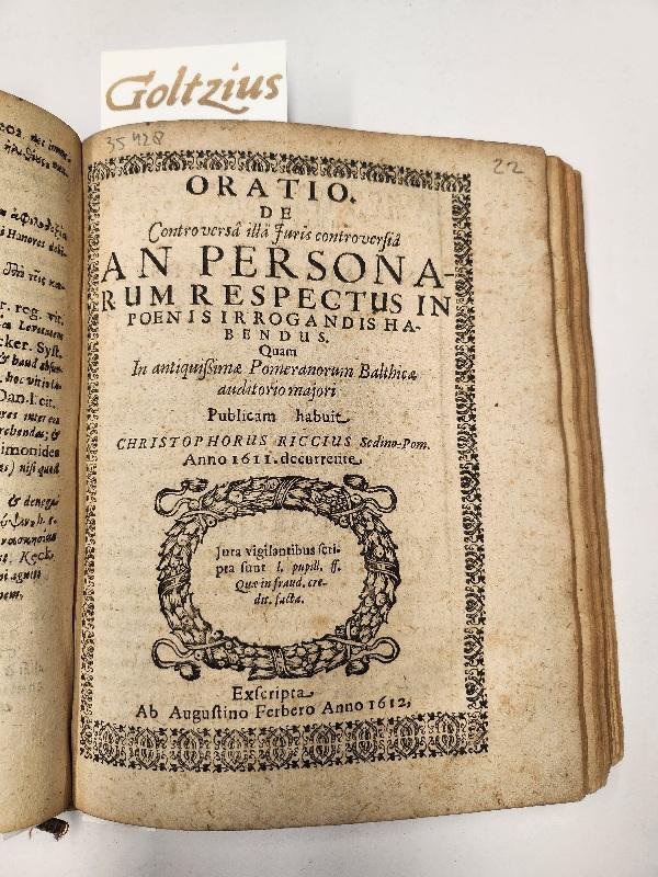 Oratio de controversa illa juris controversia an personarum respectus in poenis irrogandis habendus. Quam in antiquissimae Pomeranorum Balthicae auditorio majori Publicam habuit Christophorus Riccius Sedino-Pom. Anno 1611. decurrente. [Greisswald? Rostock?], Exscripta, ab Augustino Ferbero Anno 1612, 4to., without binding, [32] pp., slightly discoloured edges and with a contemporary note in the margin of the last page, clear printwork, with a printers' mark on the titlepage (Jura vigilantibus scripta sunt 1. pupill. ff. quae in fraud. creadit. facta.) and decorative elements such as borders and an initial. Christophorus Riccius (1590-1643) was a German lawyer.