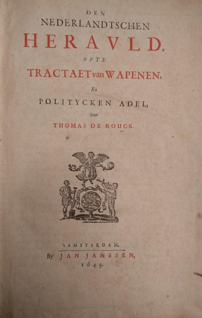 Den Nederlandtschen Herauld ofte Tractaet van Wapenen en politycken adel. Amsterdam, Jan Janssen, 1645, 4o. full parchment spitsel binding (spitselband), 370+56+8 pp., good condition. Illustrated with many heraldic woodcuts in the text and some full page engravings showing full figure portraits of historical figures. First edition of De Rouck's work on heraldry, of which two more editions would be published in 1671 en 1673, but with different titles. It is the oldest and only Dutch work on heraldry until the mid nineteenth century. De Rouck developed a hatching system to convey heraldic colors in print. A table of this hatching system is found on page 55 of the second part. l Including: "Tweede deel des Nederlandtschen Herauld: ofte Korte beteeckeninghe der Konst-Woorden, ende Formulen van spreecken in Herauldie, door den selven autheur, Thomas de Rouck" (Leyden, Willem Christiaens vander Boxe, 1645) and "Waerschouwinghe aen den leser". Printer's mark on title page, title page in red and black ink, decorated initials, Roman fonts (regular and italic) combined with a Gothic font. Handwritten note of ownership on flyleaf (Stoop 't Onstein) and on the next page (Stoop 1856, with a drawing of the family crest).