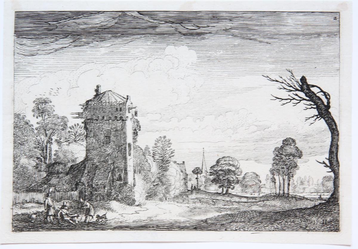 Farm built against a square tower [Set title: Amenissimae aliquot regiunculae...]/Boerderij met vierkante toren. A print showing a farm built against a square tower; figures in the foreground left. Numbered at the bottom and at the top, '11' and '2' respectively. l Etching on paper, with some margins; plate mark: 135 x 198 mm, total: 147 x 210 mm, state II/3; 'Pro Patria watermark'; Hollstein 254, Fr. 293.