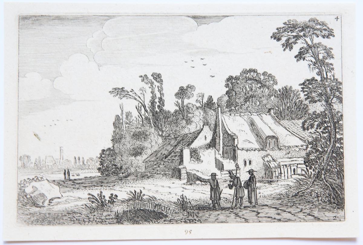 Farm along a country road [Set title: Amenissimae aliquot regiunculae... (4th volume)]. Farm along a country road; small stone bridge in the front, three men on the path on the right. Numbered on the bottom and top right, '2' and '4' respectively. The number '95' has been added at the bottom, center. l Etching on paper, with some margin; plate mark: 123 x 190, total: 136 x 203 mm, state II/4; in great condition; Hollstein 269, Fr. 308.