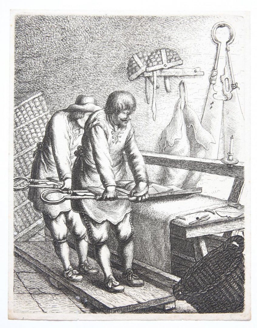 Cloth-shearers (doek-scheerders) [set: Crafts and trades]. Two cloth shearers in a workshop, working at the light of a candle; The tools of the craft hang in the room. From the set 'Crafts and trades'. l Etching on laid paper, with some margins; plate mark: 210 x 162 mm, total: 218 x 169 mm; state II/2, Hollstein 45, Bartsch 45; in very good condition.