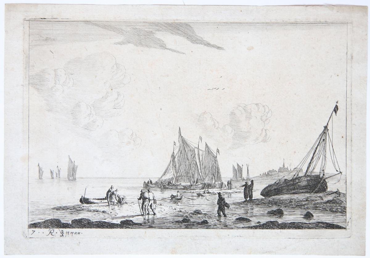 Beach scene with ketches and other fishing boats [set title: Inland Waterways] (strand met boten). Plate from a series of views on internal waters. Beach scene with ketches and other fishing boats. Signed and numbered on the bottom: '7 R. Zeeman'. l Etching on paper with some margin; plate mark: 133 x 200, total: 152 x 221 mm, state I/2, double margins not yet defined; Hollstein 110, Bartsch 37, Weigel 1843, p. 251.