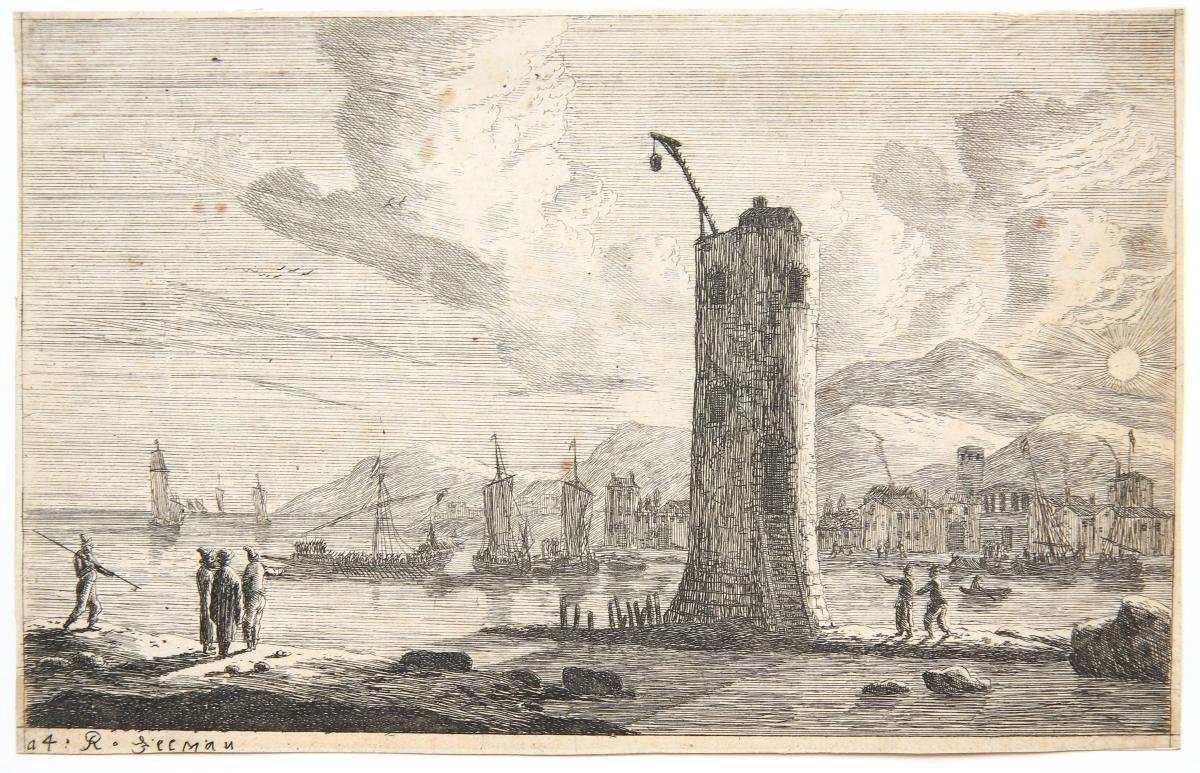 Harbour scene with a tower [set title: Various seaports]. From a set of views of sea ports, this is plate nr 4, representing a harbour with a tower and figures. Numbered and signed at the bottom: 'a4 R. Zeeman'. l Etching on paper; trimmed to plate, total: 128 x 202 mm, state II/2, light foxing, mounted on cardboard on the four corners. Hollstein 99, Bartsch 98, Weigel 1843, p. 248.
