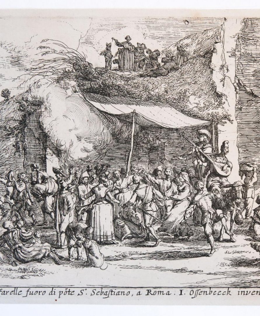 La Cafarella; Prospetto e veduto a Cafarelle fuoro di Porte S. Sebastiano a Roma. La Cafarella, a festival near the grotto of Egeria in Rome. Titled and signed at bottom: 'Prospetto e veduto a Cafarelle fuoro di Porte S. Sebastiano a Roma. I. Ossenbeeck invent. et fecit.'. Characters making music, drinking and feasting. On verso collector's marks: F.C.Th. baron of Isendoorn á Blois (L.2610), Rijksprentkabinet, Rijksmuseum Amsterdam (L.699), Rijksprentkabinet, Leiden (L. 700b), Pim van Eekelen (Amsterdam 1923-1984), L.5101. l Etching on paper with some margins, on modern paper; plate mark: 147 x 334 mm, total: 155 x 341 mm; state II/2, Hollstein 25, Bartsch 25, Wurzbach 25.