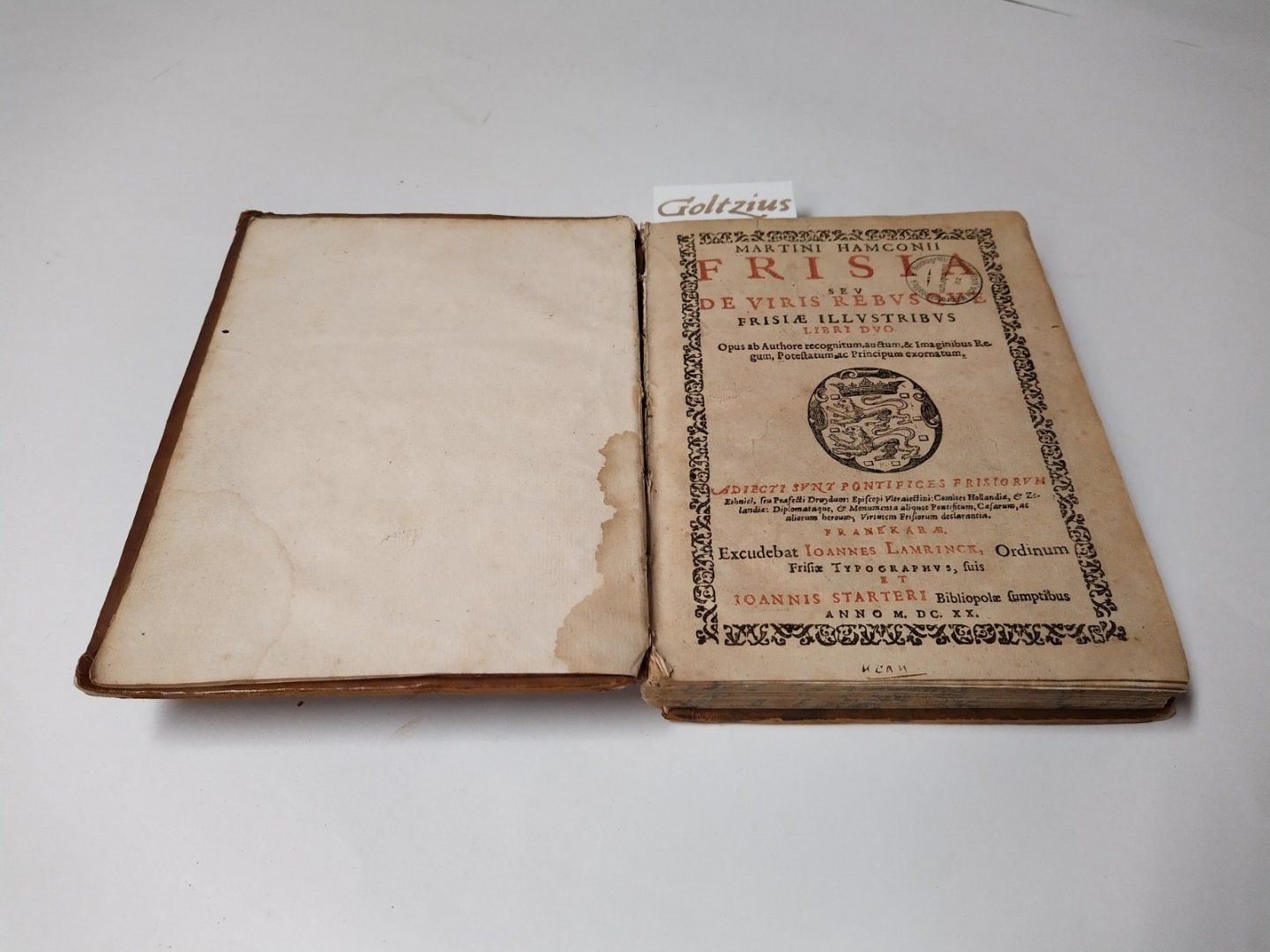 Frisia seu de viris rebusque Frisiae illustribus. Libri duo. Franeker, Ioannes Lamrinck et Ioannes Starteri, 1620, 2nd edition, 4o., full leather binding with gold tooling and title plate on spine, marbled edges, marbled paper on the inside of the covers, dedication (to Albert archduke of Austria) + 131 ff. (foliated pages, last folio incorrectly numbered 127, should be 131) + index, worn binding with scratched covers and damages hinges, title page weak and with a library stamp (Warmbrunn), first and last few pages stained, heraldic woodcut on title page (heraldic crest of Friesland), some decorative woodcut elements (initials and endpiece), illustrated with two woodcut coats-of-arms of Friesland, an engraved portrait of the author (by Pieter Feddes of Harlingen, 1586-1623) and 53 etchings, good impressions. l Hamconius (1550?-1610) was (substitute-) grietman of Lemsterland and Doniawerstal in Friesland and chose the Spanish side during the Dutch Revolt, which forced him to leave Friesland afterwards. This book is his main work, first published in 1609 (3rd edition in 1623). The reprints are illustrated with 53 impressive full page etched full body portraits of the counts and lords of Friesland and their coat-of-arms, with decorative margins, a landscape in the background with some scenes related to their person.