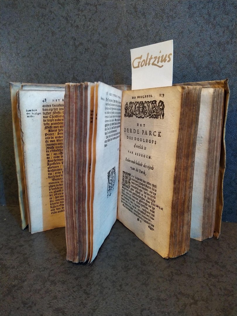 Den doolhof der ketteren Antwerp (Hantwerpen), Ioachim Trognaesius, 1605, 8vo., full parchment binding, handwritten title on spine, red coloured edges, [26]+534+[18] pp., smudges and somewhat damaged parchment (especially the back), loosenend structure with some signatures coming undone, some (water)stains, some worming in the first blank pages. With several writings in different hands and from different periods of time: the oldest note seems to be on the inside of the parchment front cover, then there is one in red ink, one in darker ink (Eduard (?) van Dijk), another one in red ink in Latin (starting with: sum Guberti (?)), another darker one (Antonius de Raue (?) Retogitabo) and an ex libris note from a library. In the back "Van Fraater Tunissen". The notes are all difficult to read. Printer's mark on titlepage (Augetur), several head- and tailpieces and some decorative initials. Extensive work on heresy and the way in which heretics endanger the world. Scarce.