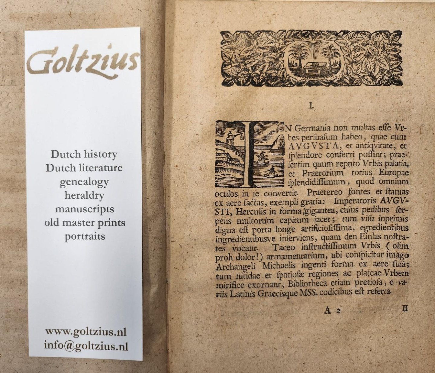 | Bijzonderheden: | Wittenberg, Prelo Gerdesiano, [1704], 4to., [16] pp. without binding, Diss. Wittenberg letteren 15-10-1704. l Zingt de lof van Augsburg, met nadruk op de bibliotheek en haar bezittingen, waarbij zowel manuscripten als gedrukte boeken worden genoem... |