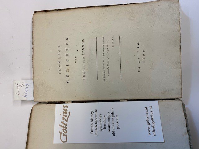 Jeugdige gedichten van Gerrit van Lennep Leyden, [no publisher], 1794, (16)+81+(2) pages, original paper on board binding, top of spine damaged, early poetry by Gerrit van Lennep (1774-1833), previously owned by H. van Streun (ink name on first page), Scarce. .
