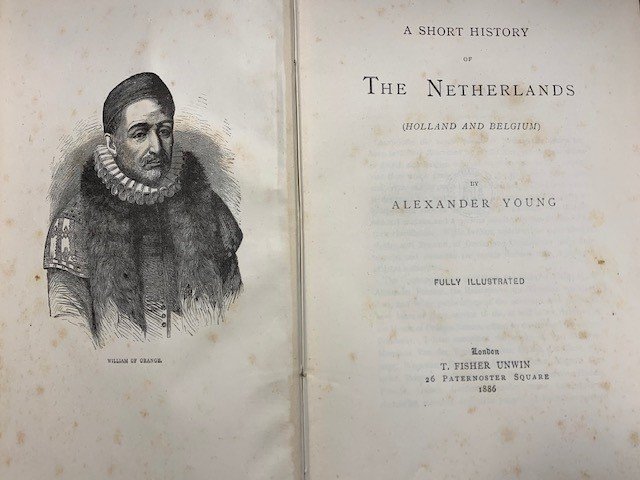 A short history of The Netherlands (Holland and Belgium) by Alexander Young, fully illustrated London, T. Fisher Unwin, 1886, 579+advertisments (uncut) pages, original red linnen binding, gilt lettering on spine, back shows humidity damage, b/w illustrations, frontispiece portrait of Willem van Oranje, armorial bookplate of G.A. van der Steur.