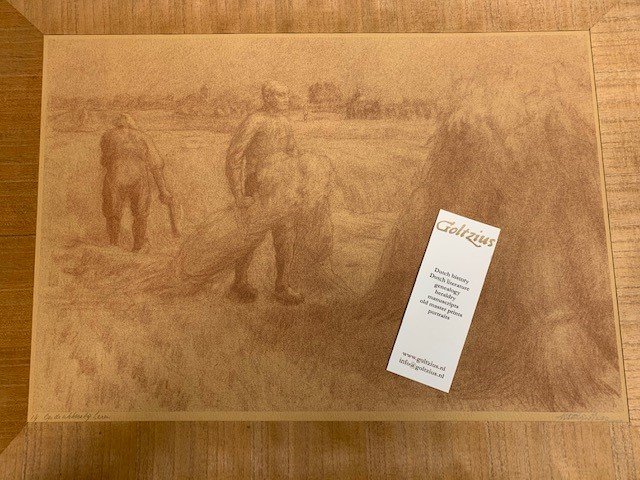 14. Op de akkers bij Laren, by Matthijs Hage (1882-1961) possibly 1914 Lithograph print, 35x50cm, in faux wooden frame, title "14 Op de akkers bij Laren" in pencil, signed right bottom corner "Matthijs Hage" in pencil. Matthijs Hage was a Dutch painter, etcher, and lithograph, he lived and worked in Laren between 1911 and 1924, good quality lithograph of this interesting artist.