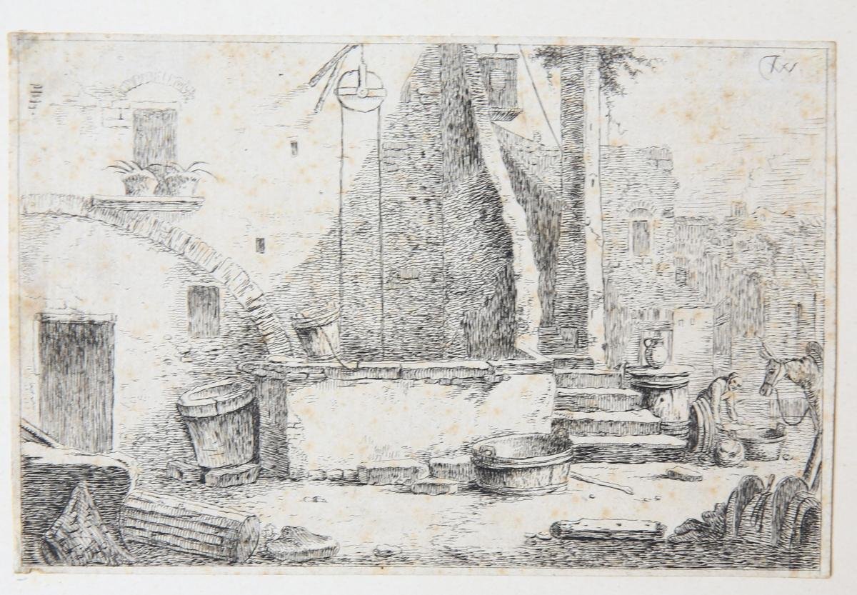 The well [set: Landscape scenes with ruins] (de put met vrouw en ezel). A well in front of a house; a woman and a donkey on the right. Monogrammed on the top right: TW. l Etching on paper, trimmed within plate mark; total: 77 x 119 mm; Hollstein 10 (copy); yellowed paper, with some foxing; mounted on cardboard.