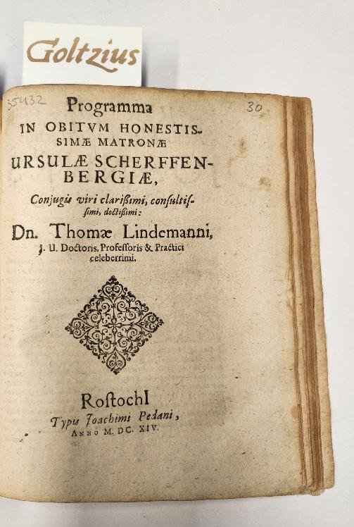 Programma in obitum honestissimae matronae Ursulae Scherffenbergiae, conjugis viri clarissimi, consultissimi, doctissimi: Dn. Thomae Lindemanni, j.u. doctoris, professoris & practici celeberrimi. Rostock, Typis Joachimi Pedani, 1614, 4to., without binding, [8]pp., some small stains, Oratie Rostock 8-12-1614 ; (8) pp.