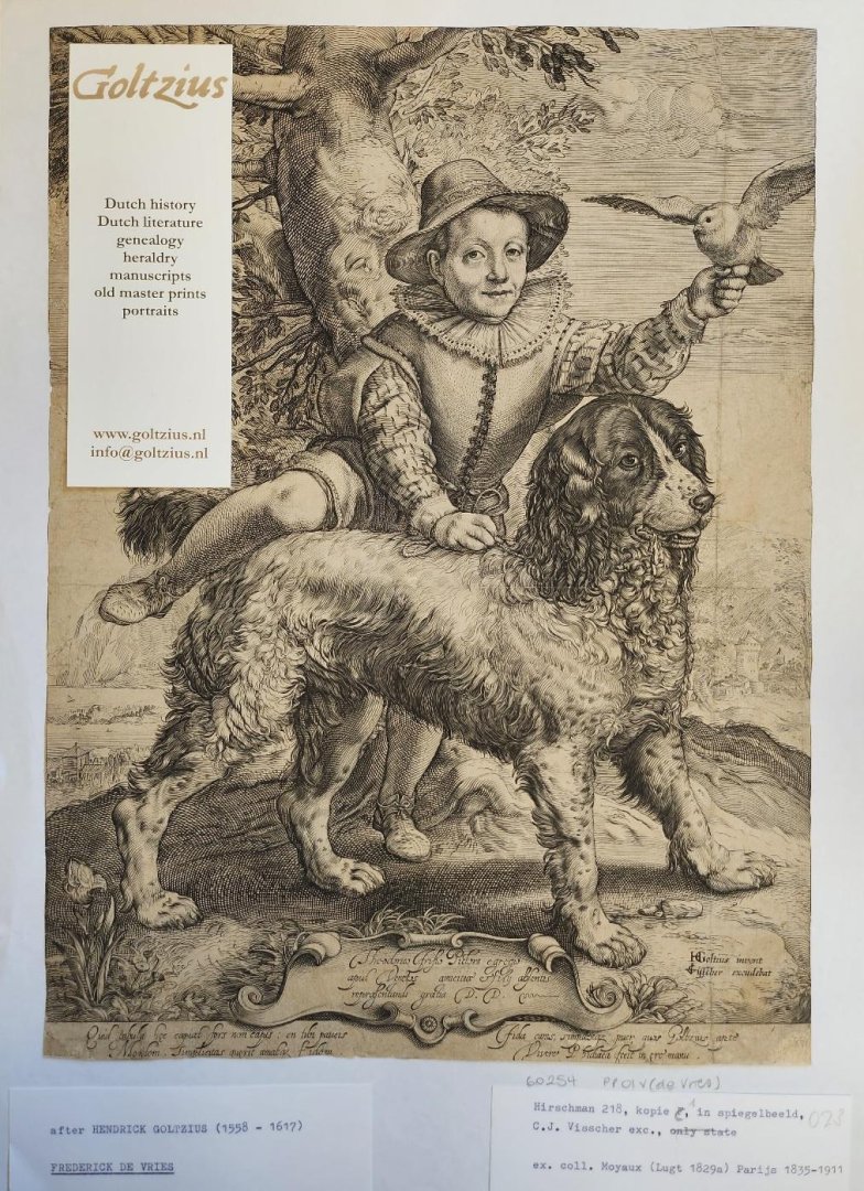 Portrait of Frederik de Vries Portrait of Frederik de Vries as young boy playing with Goltzius' dog. Frederik was the son of the painter Dirck de Vries, a pupil of Goltzius. The boy is trying to get on the back of the dog while holding a bird in his hand. On the cartouche below some text in Latin. The text on the bottom is about a boy and a dog. Anonymous copy in reverse with mention of the artist and the publisher, 'HGoltzius invent' and Claes Jansz. Visscher 'CIVisscher excudebat' (CVI monogrammed). On the verso collector's mark of C. Moyaux (Lugt 1829a). l Engraving on paper, trimmed within plate mark; total: 350 x 259; state I/3; several damages repaired on the back; evenly yellowed paper; New Hollstein 256c