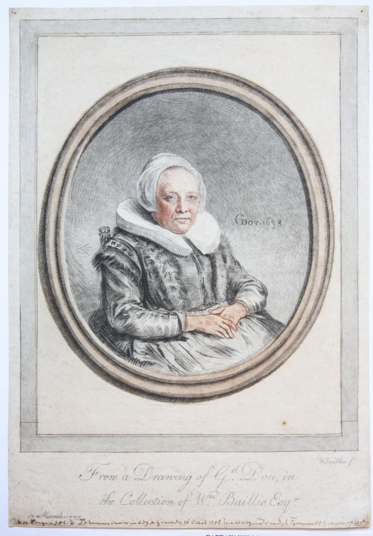 Old woman, after G. Dou. Half length portrait of an old woman, likely Dou's wife at an old age, seated on a chair, turned towards the right. In an oval. Signed within oval on the right: 'GDou. 1638' (GD monogrammed). Lettered at the bottom: 'From a Drawing of G.d Dou, in / the Collection of W.m Baillie Esq.r'. In old handwriting at the bottom in brown ink: 'Het origineel v. tekening is van deze grooten 16. Octob. 1759 uit de versameling van syb. Fijtama is verkogt voor f. 299-'. Signed also on the bottom of the frame to the right: 'WBaillie f', dated on the bottom left: '17 March 1775'. A frame in gray is added around the oval frame. l Printdrawing or soft ground etching and watercolor on paper, trimmed to plate; total: 327 x 226 mm; two pin holes on the top corners. Le Blanc 44.