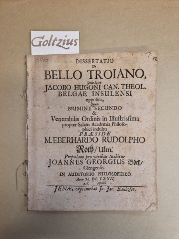 Dissertatio de bello Troiano , praecipue Jacobi Hugoni Can. Theol. Belgae insulensi opposita Jena Bauhofer 1672 Diss. Jena ?-4-1672 ; (40) p. Without binding l Afwijzing van de Vera historia Romana van Jacobus Hugo (Rome 1655). Slotverzen van J.C. Hundeshagen, C. Sagittarius, praeses, M.R. Roth, J.D. Haakius, B. Meyer, J.D. Zech, C. Bucherer, J.J. Hoffmann en J.L. Michel.
