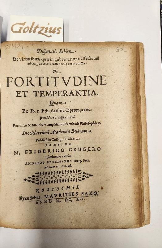 Disputatio ethica de virtutibus, quae in gubernatione affectuum ad corpus relatorum occupantur, nim: De fortitudine et temperantia (...) publicè in Collegio Unicornis praeside M. Friderico Crugero difcutiendam exhibet Andreas Brummerus Starg. Pom. ad diem 12, Novemb. Rostock, Moritz Sachs, 1614, 4to., without binding, [16]pp., discoloured edges and some creased pages, clear printwork, some decorative borders. With celebratory poems by Christophorus Riccius, Sidino-Pom., en Johannes Blocius, Stoltquell. March.