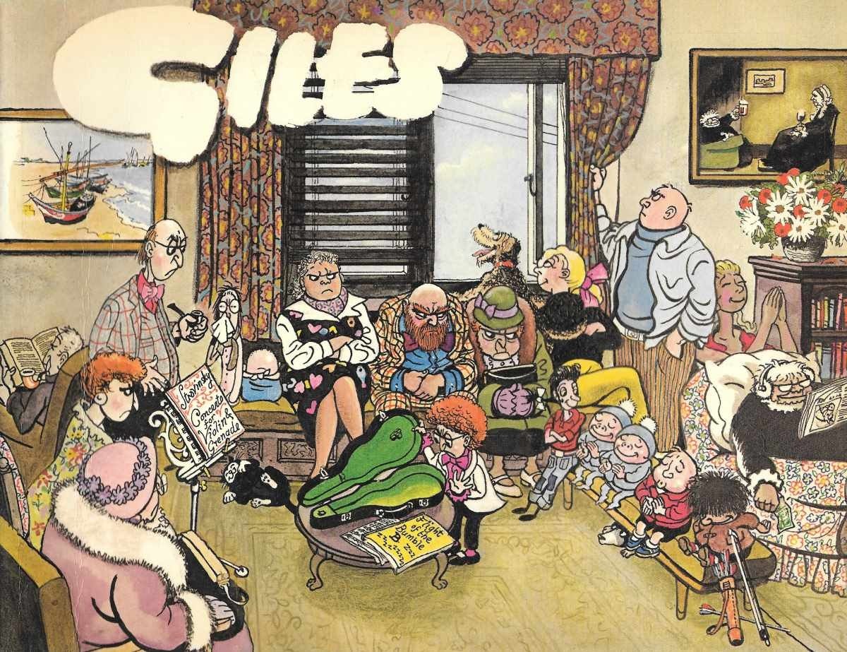 Giles (30 serie) Ronald "Carl" Giles OBE (29 september 1916 - 27 augustus 1995), vaak simpelweg Giles genoemd , was een Cartoonist die vooral bekend stond om zijn werk voor de Britse krant de Daily Express. Zijn tekenfilmstijl was één actueel, zeer gedetailleerd paneel, meestal met veel meer aan de hand dan de enkele grap. Bepaalde terugkerende personages verwierven veel populariteit, met name de uitgebreide Giles-familie , die voor het eerst verscheen in een gepubliceerde cartoon op 5 augustus 1945 en een prominente plaats in de strip kreeg. De meest herinnerde hiervan is de raadselachtige matriarch van de familie, gewoon bekend als oma. |