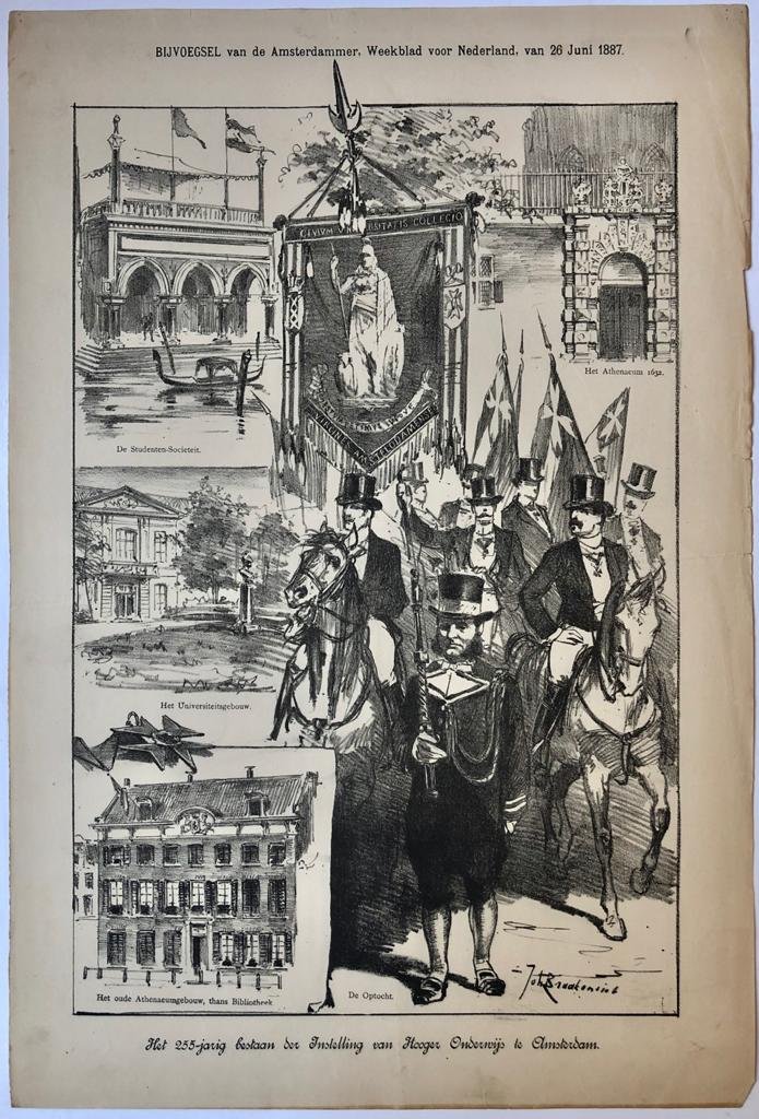 | Titel: | [Original lithograph/lithografie by Johan Braakensiek] Het 255-jarig bestaan der Instelling van Hooger Onderwijs te Amsterdam, 26 Juni 1887, 1 pp. |
