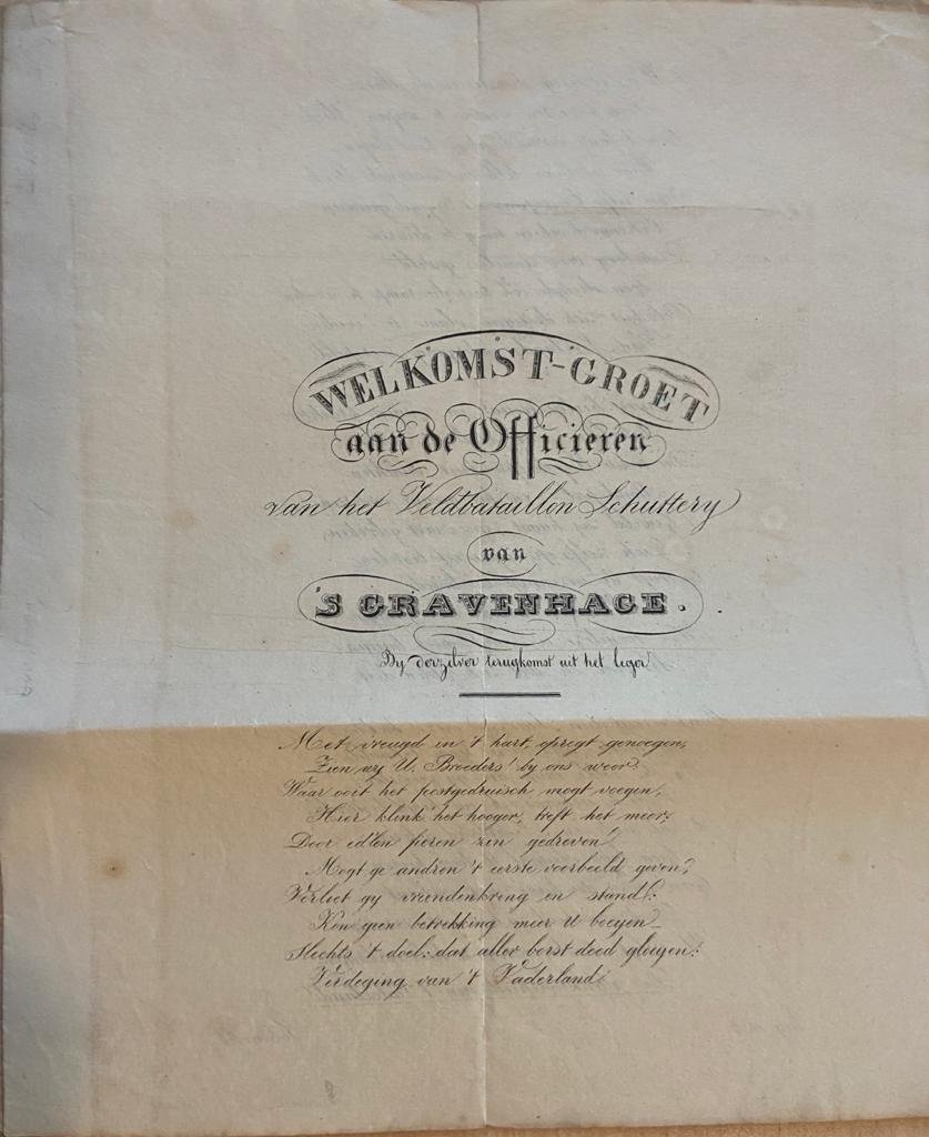 | Titel: | [History of The Hague, Military] Two pamphlets: 1) Welkomst-groet aan de Officieren van het Veldbataillon Schuttery van ’s Gravenhage, by verzelver terugkomst uit het leger, Den Haag, 1834, 2 pp. 2)Hulde aan H H Officieren van het Bataillon Mo... |