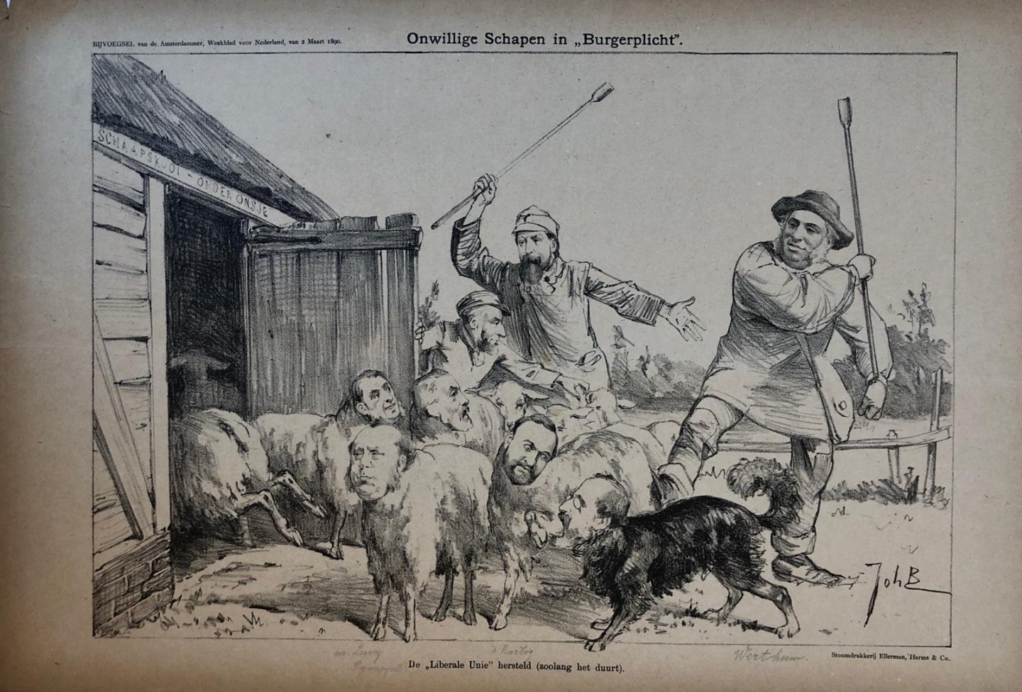 | Bijzonderheden: | 300 x 440 mm. Bijvoegsel van de Amsterdammer, Weekblad voor Nederland, van 2 Maart 1890. Onwillige Schapen in "Burgerplicht". De "Liberale Unie" hersteld (zoolang het duurt). Amst. Boek- en Steendrukkerij, v/h. Ellerman, Harms & Co. |