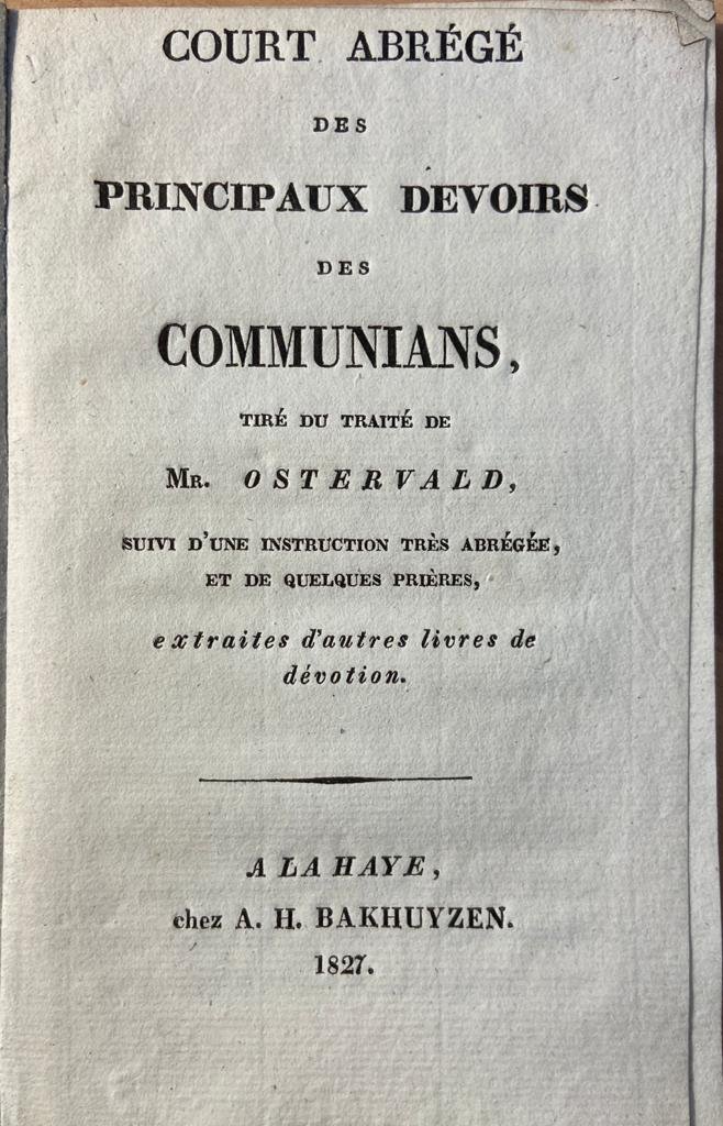 | Titel: | Court Abrégé des principaux devoirs des communians, tiré du traité de Mr. Ostervald, suivi d’une instruction très abrégée, et de quelques prières, extraites d’autres livres de dévotion, A. H. Bakhuyzen, La Haye, 1827, 39 pp. First edi... |
