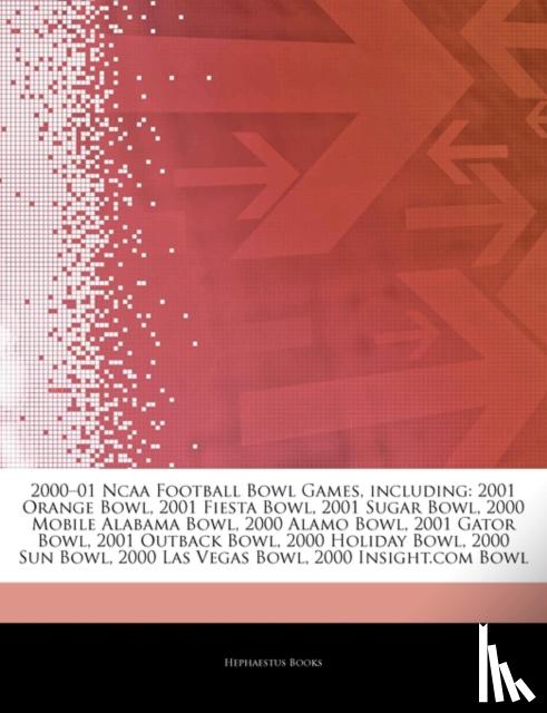 | Titel: | Articles on 2000a 01 NCAA Football Bowl Games, Including - 2001 Orange Bowl, 2001 Fiesta Bowl, 2001 Sugar Bowl, 2000 Mobile Alabama Bowl, 2000 Alamo Bowl, 2001 Gator Bowl, 2001 Outback Bowl, 2000 Holiday Bowl, 2000 Sun Bowl |