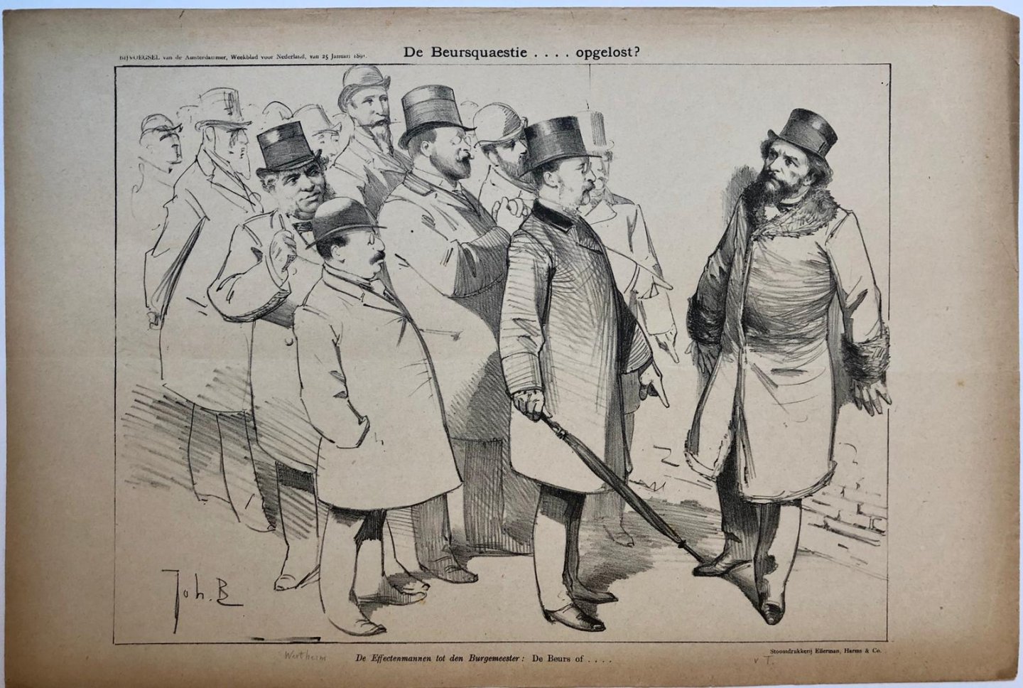 | Bijzonderheden: | 300 x 440 mm. Bijvoegsel van de Amsterdammer, Weekblad voor Nederland, van 25 Januari 1891. De Beursquaestie .... (beurskwestie) opgelost? Pictured are De Effectenmannen and De Burgemeester (Mayor). Written in pencil is the name Westheim. Stoomdru... |