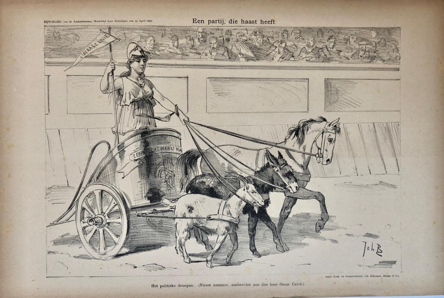 | Bijzonderheden: | 300 x 440 mm. Bijvoegsel van de Amsterdammer, Weekblad voor Nederland, van 19 April 1891. Een partij, die haast heeft. Het politieke driespan. (Nieuw nummer, aanbevolen aan de nheer Oscar Carrè.) Amst. Boek- en Steendrukkerij, v/h. Ellerman, Harm... |