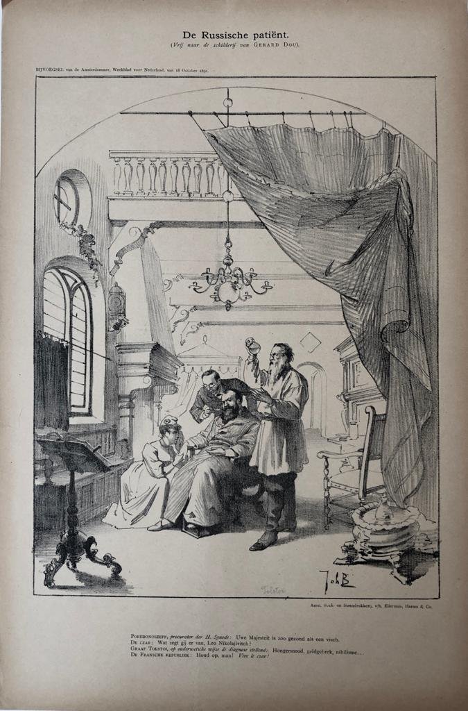 | Bijzonderheden: | 440 x 300 mm. Bijvoegsel van de Amsterdammer, Weekblad voor Nederland, van 18 October 1891. De Russische patiënt. (Vry naar het schilderij van Gerard Dou). Pictured are Pobedonoszeff, procurator der H. Synode, De Czar, Graaf Tolstoi (Count) and D... |