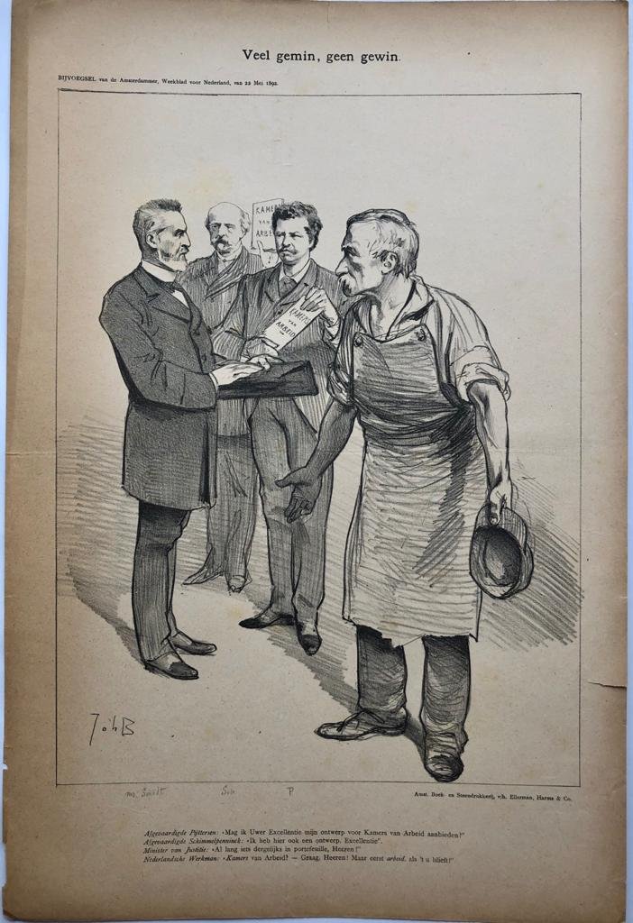 | Bijzonderheden: | 300 x 440 mm. Bijvoegsel van de Amsterdammer, Weekblad voor Nederland, van 22 Mei 1892. Veel gemin, geen gewin. Pictured are Afgevaardigde(deputy) Pijttersen, Afgevaardigde Schimmelpenninck, Minister van Justitie (Minister of Justice) and a Nederl... |