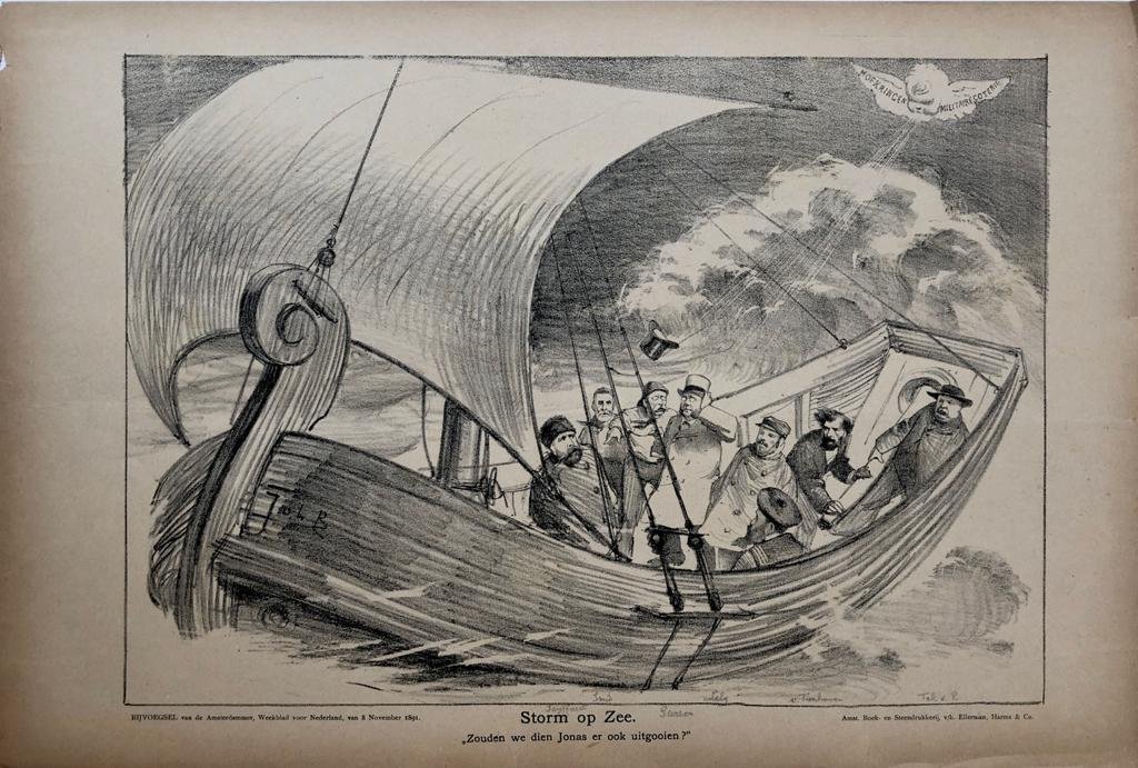 | Titel: | [Original lithograph/lithografie by Johan Braakensiek] Storm op Zee, "Zouden we die Jonas er ook uitgooien?" 8 November 1891, 1 pp. |