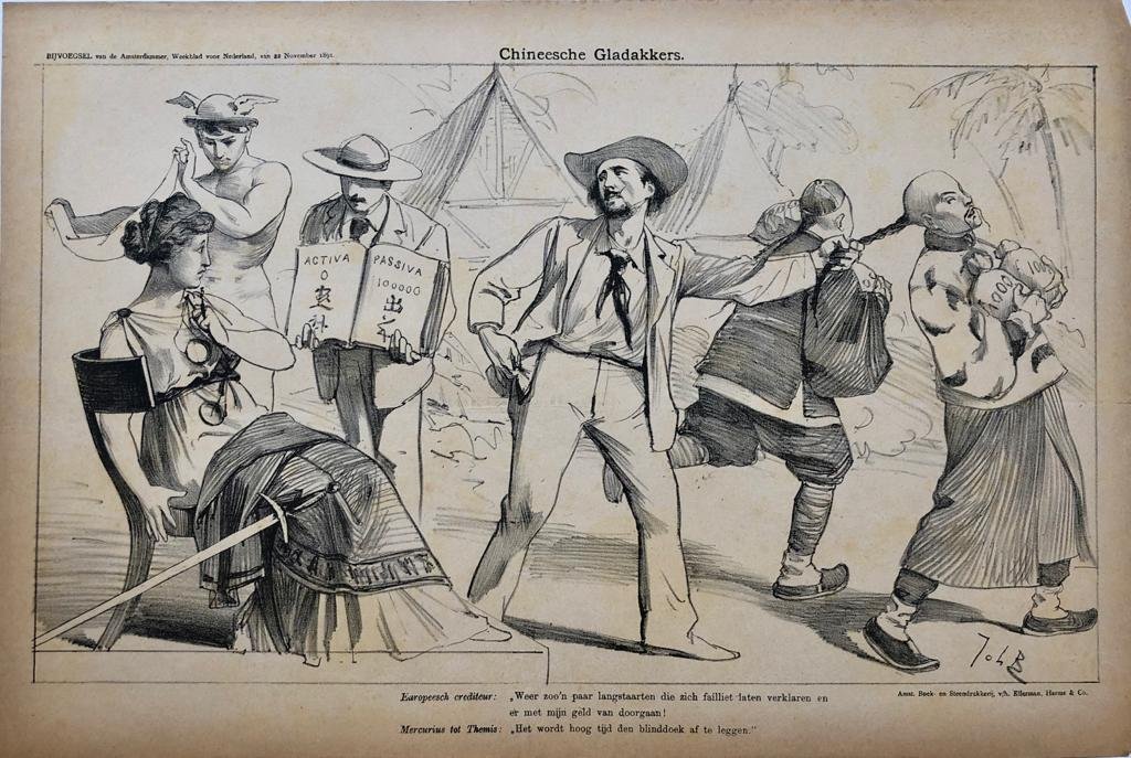 | Bijzonderheden: | 300 x 440 mm. Bijvoegsel van de Amsterdammer, Weekblad voor Nederland, van 22 November 1891. Chineesche Gladakkers (Chinese gladakkers). Pictured are a Europeesch crediteur (European creditor), Mercurius (Mercury) and Themis. Amst. Boek- en Steend... |