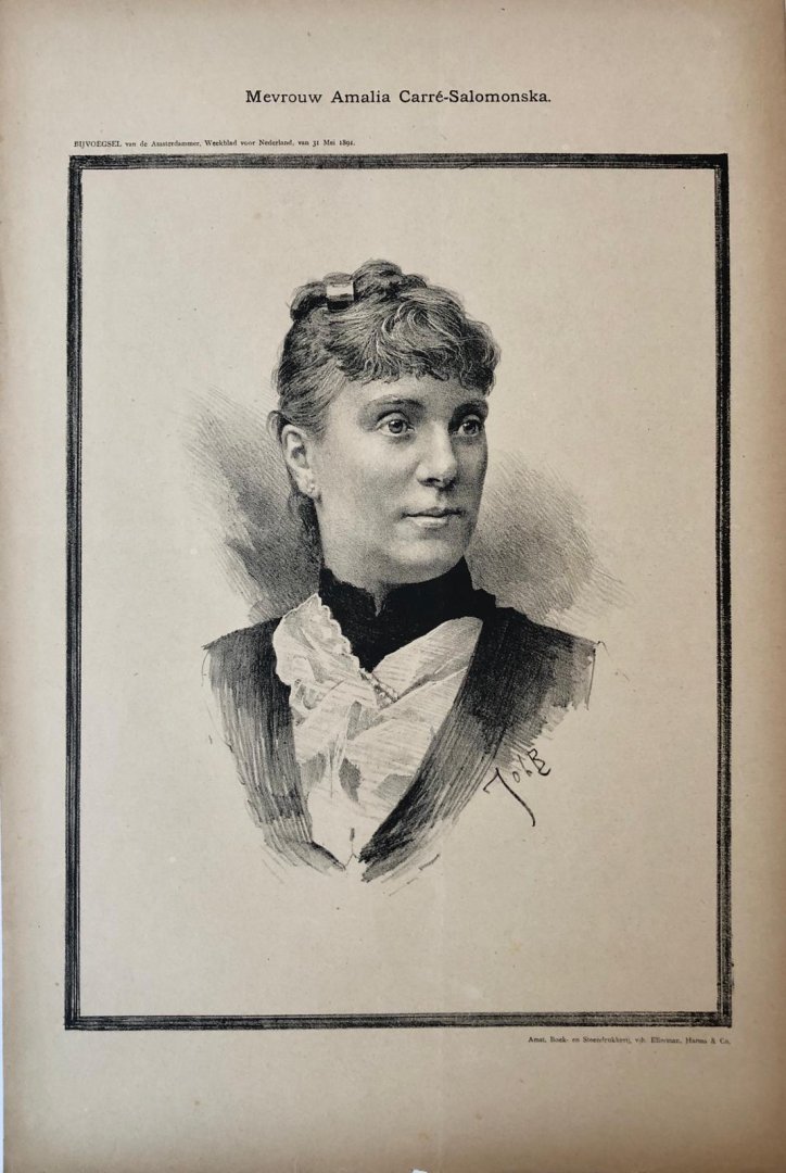 | Bijzonderheden: | 440 x 300 mm. Bijvoegsel van de Amsterdammer, Weekblad voor Nederland, van 31 Mei 1891. Portrait of Mevrouw Amalia Carré-Salomonska. Amst. Boek- en Steendrukkerij, v/h. Ellerman, Harms & Co. |