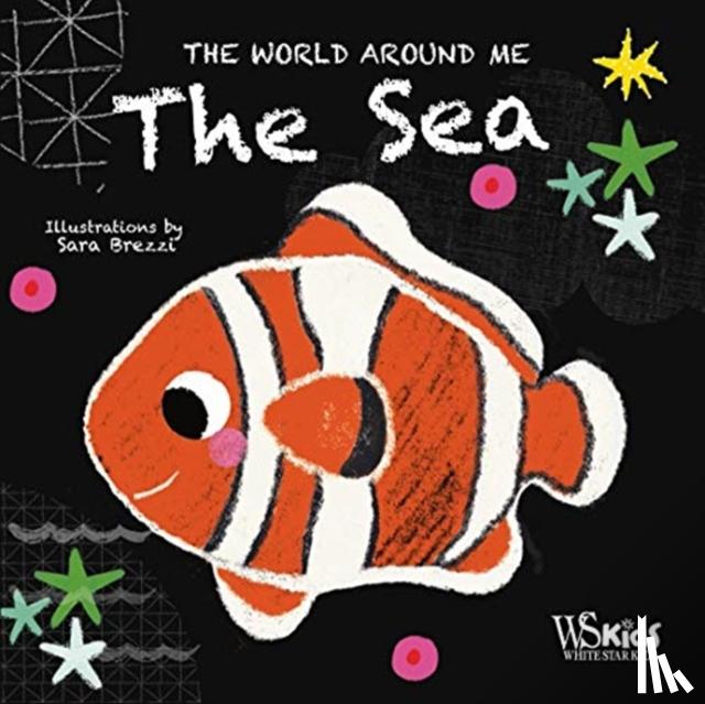 Flaptekst Dive deep down into the sea, and meet a variety of interesting creatures that swim below the waves. All appear on a chalkboard-like surface in bright colors, including an orangey crab, a blue dolphin, a pink jellyfish, a striped clownfish, and an octopus, shark, and golden starfish. |