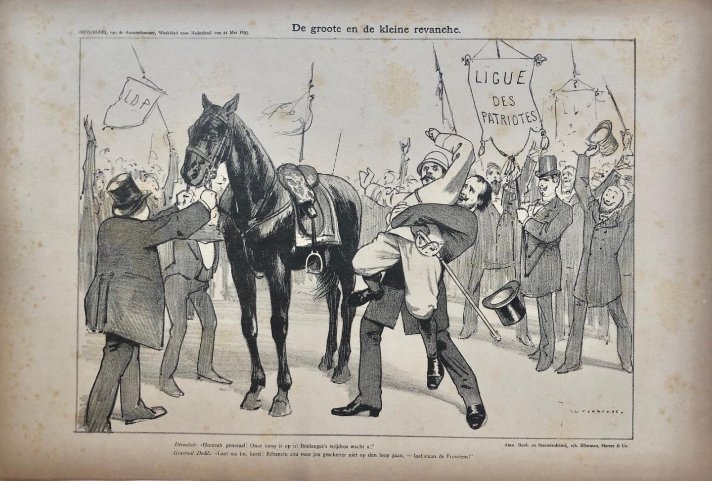 | Bijzonderheden: | 300 x 440 mm. Bijvoegsel van de Amsterdammer, Weekblad voor Nederland van 21 Mei1893. De groote en de kleine revanche. Pictured are Déroulède and Generaal Dodds (General). Amst. Boek- en Steendrukkerij, v/h. Ellerman, Harms & Co. |