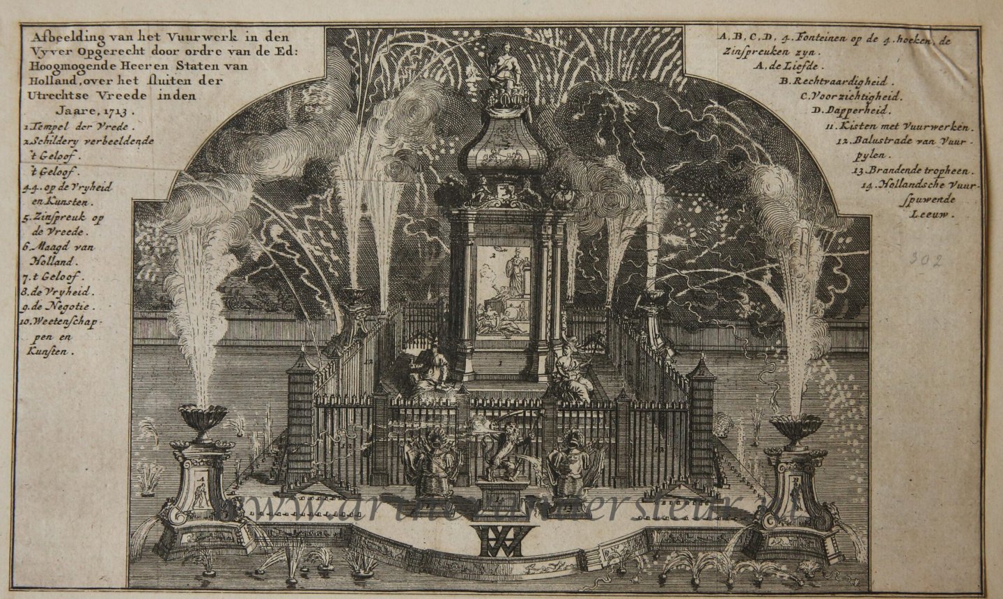 | Bijzonderheden: | Installation with fireworks set off by order of the States General on the Hofvijver in The Hague [Vuurwerk op de Hofvijver in Den Haag] during the celebration of the Peace of Utrecht, 14 June 1713. On both sides of the image the title and legend i... |